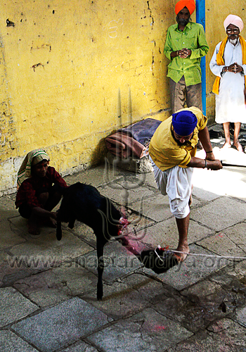 "The great orders which initiate Khalsa at the 'Takhts', especially during 'Navrata' (nine days of Chandi worship), worship the weapons by reading 'Chandi Charitra' [and other] war scriptures of the tenth Master. At the Hari Mandir Sahib in Amritsar, with the completion of all the readings at the 'Akal Takht', on the 'Vijay Dasmi' (tenth day that Lord Raam gained victory over the demon Ravana by killing him), the readings were then taken from 'Bachittar Natak' and the 'Raam Avatar'. As the point of Ravana's death was reached in the recitation, in the tradition of infusing warrior spirit, in the spirit of rage and horror [was performed] by the 'chatka' (decapitation with sword) of goats; surrounded by thousands of people in the area reserved for holding gatherings [in front of the Akal Takht under its 'Nishan Sahib' (battle standard)]. Seeing this fearful sight, the Singh Khalsa fills with joy, the weapons are anointed with the blood, and their limbs quiver with power. Those who believe non-violence is the highest Dharam, these superstitious beings, becoming cowards and lacking courage, are unable to watch or listen. Closing their eyes and covering their ears, they cannot find an escape route to run to. In the Sikh Panth, we have [the Guru's] permission to hunt animals and to 'chatka' of domesticated animals such as goats, etc. and to eat meat; it is from the Hindu tradition."