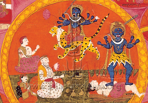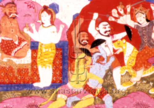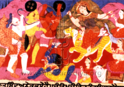 There are ten classical fighting forms in Sanatan Shastar Vidiya termed 'Yudhan' (combat forms) or 'Pentra' (tactical deployments). The first six Yudhan are known as 'Khat Ang' (six limbs). These six Yudhan are based upon characters from Indian mythology that possess animal forms. When integrated, they form the seventh limb - the leopard 'parjog' (application). Beyond these are three more advanced forms referred to as 'Dev Ang' (limbs of the gods), which are based upon Shiva and his consort, the Devi (also known as 'Shakti', 'Durga', 'Chandi', etc.).