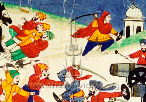 "An Afghan [guard] tried to get hold of one [imprisoned] Singhni. She grappled the Afghan to the floor and pounded in his ribs. The fiend screamed in agony. Three or four more guards then came. Taking one Afghan's sword, the Singhni swiftly cut down these other three. Other 'Singhnia' took hold of their swords, and, like cheetahs, they drew them and attacked. In showing them the pleasure of touching Sikh women, they had wounded thirty and killed ten. The other guards stood back, afraid and refused to come near and fight. Without orders, they fired arrows and muskets upon the women."