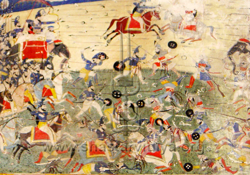 "Kharag Singh greatly intoxicated in spirit of Rudra. He showed great nimbleness in the field as if a greatly blessed dancer...the battlefield consider has become a 'Rang Bhumi' (field of colour/dance)"